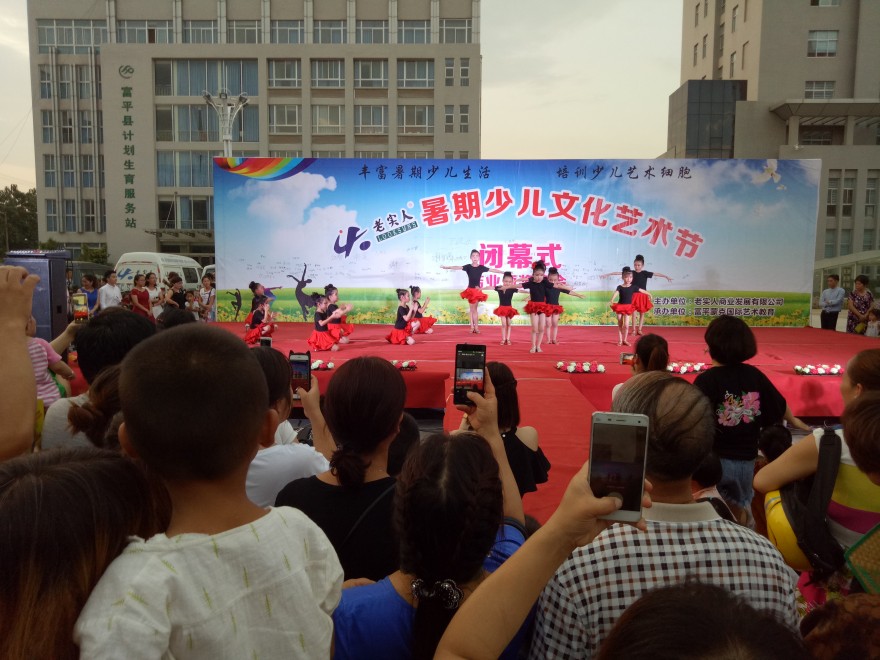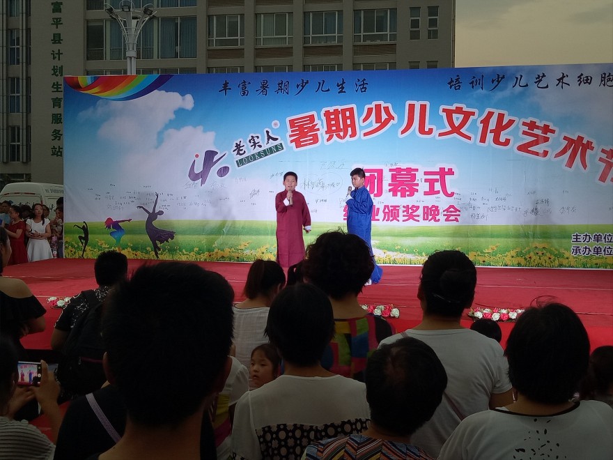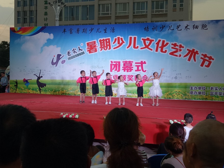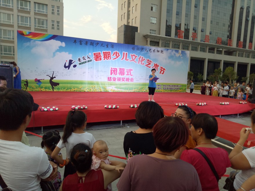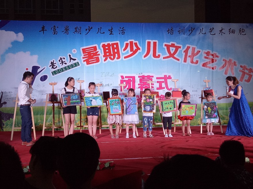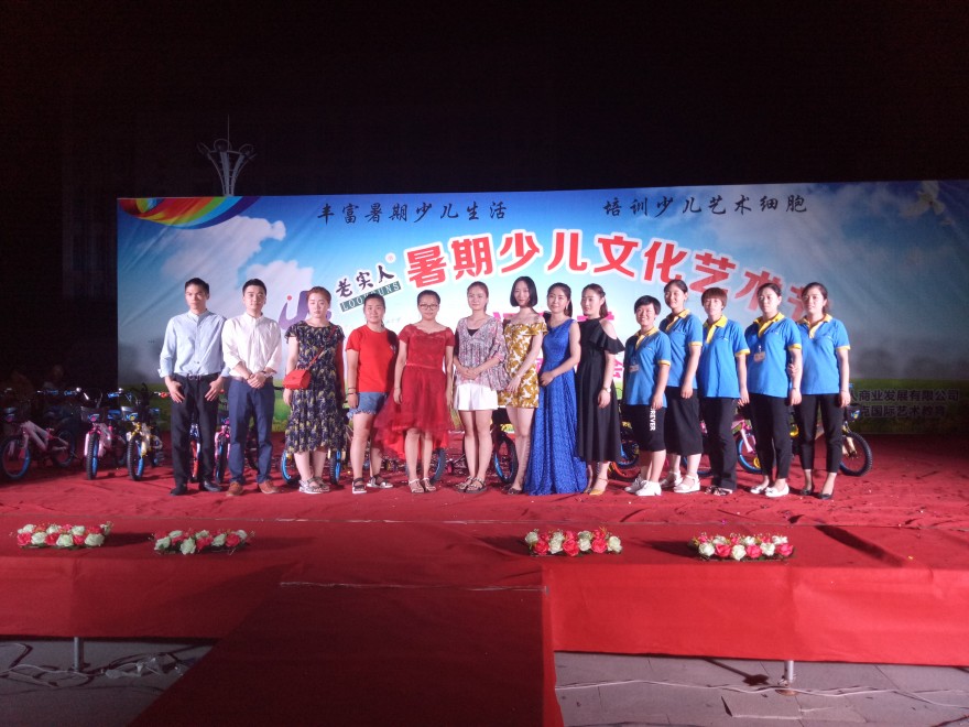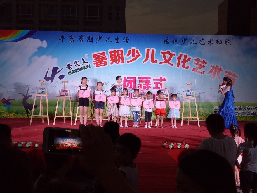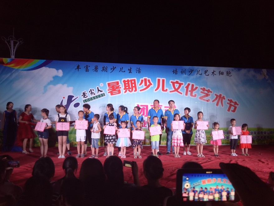 2017年8月5日晚在老实人广场举办“老实人暑期少儿艺术节闭幕式暨结业颁奖晚会”,经过一月的培训,小朋友们的认真学习,在参与培训的300余名小朋友中评选出了16名“艺术之星”,10名“创意之星”,8月5日晚对评选出来的优秀学员公开表彰予以鼓励和认可。小朋友们还准备了一场艺术的盛宴,他们用他们的语言、舞蹈来诠释了精彩。